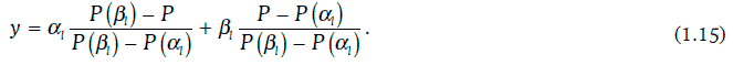 Для решения уравнения (1.14) можно использовать метод проб и ошибок. Вначале найдем простым подбором числа α1 и β1 так, чтобы P(α1) > Р, а P(β1) < Р (рис. 1.2). Тогда искомая внутренняя доходность будет находиться между α1 и β1, т. е. у ∈ (α1, β1). Промежуток (α1, β1) разделим на 10 равных частей. И, вычисляя значение функции Р(у) в точках деления, найдем числа α2 и β2 так, чтобы: