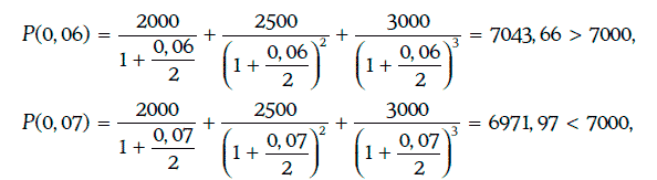 Определим внутреннюю доходность финансового инструмента при начислении процентов дважды в год, если рыночная цена финансового инструмента равна 7000 долл.