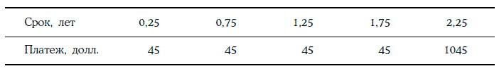 Пример 1.10. Дана 9 %-ная купонная облигация с полугодовыми купонами и номинальной стоимостью 1000 долл. Определим поток платежей по облигации, когда до ее погашения остается 2,25 года.