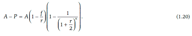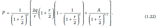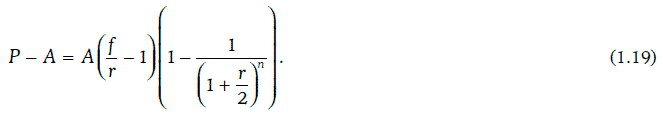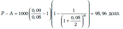 Пример 1.12. Облигация из примера 1.11 продается с премией, так как ее купонная ставка f = 0,09 выше требуемой доходности r = 0,08. Размер премии можно определить по формуле (1.19):