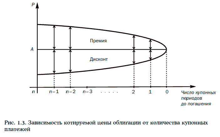 Зависимость котируемой цены облигации от количества купонных платежей, остающихся до погашения облигации, показана на рис. 1.3.