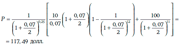 Пример 1.15. Определим цену облигаций из примера 1.14, если на рынке действует стандарт 30/360.