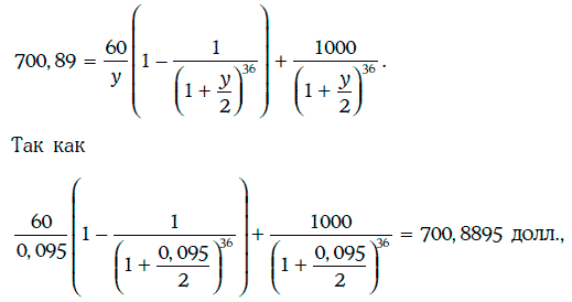 Пример 1.17. Определим текущую доходность 6 %-ной облигации с полугодовыми купонами номиналом 1000 долл., продающейся по цене 700,89 долл., когда до ее погашения остается 18 лет.