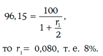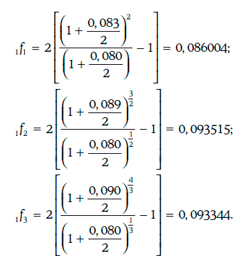 Пример 1.26. Рыночные доходности на 3 и 5 полугодовых периодов соответственно равны 8 и 9 %.