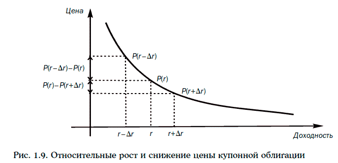 1. При одном и том же изменении требуемой доходности относительный рост цены купонной облигации всегда больше относительного снижения (рис. 1.9).