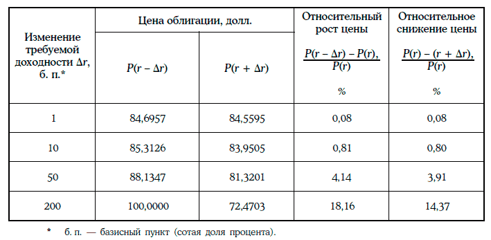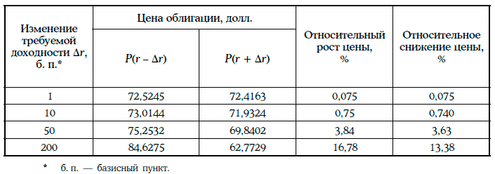 Относительный рост и относительное снижение цены облигации при различных изменениях требуемой доходности приведены в таблице: