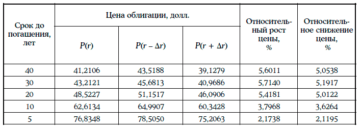 Пример 1.29. Даны 5-летние облигации с полугодовыми купонами при требуемой доходности r = 10 %, купонные ставки которых равны 0, 8 и 12 %. Относительный рост и относительное снижение цен облигаций при изменении требуемой доходности на 10 базисных пунктов приведены в таблице: