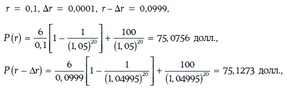 Пример 1.32. Рассмотрим 6 %-ную облигацию с полугодовыми купонами, когда до погашения остается 10 лет, а требуемая доходность равна 10 %.