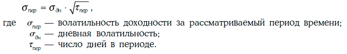 Если случайные величины Xt не коррелируют между собой, то, зная дневную волатильность доходности финансового инструмента, можно оценить волатильность доходности этого инструмента за данный период времени: