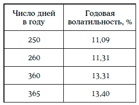 В частности, для того чтобы определить годовую волатильность, необходимо для каждого конкретного случая правильно определить число рабочих дней в году. Число рабочих дней в году может быть равным 250, 260 или 365.