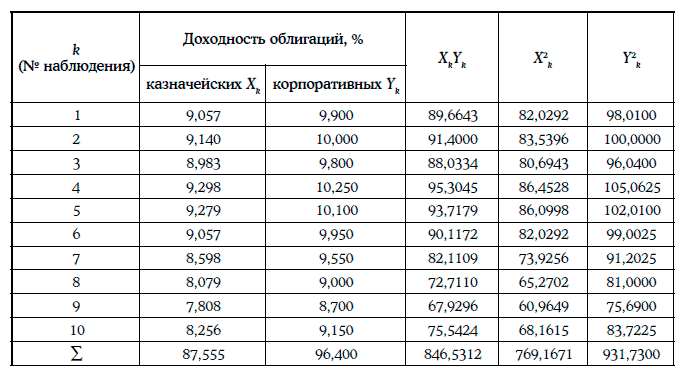 Пример 1.63. Построение линейной регрессионной зависимости доходности среднесрочных корпоративных облигаций одного и того же кредитного рейтинга (η) от доходности 10-летних казначейских облигаций (ξ). Исходная информация и предварительные расчеты приведены в таблице ниже.