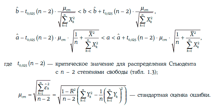 Если предположить, что случайные погрешности не коррелируют между собой (т. е. отсутствует автокорреляция), то доверительные интервалы для коэффициентов регрессии с надежностью 95 % строятся следующим образом:
