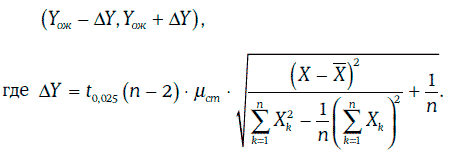При отсутствии автокорреляции[17] и гетероскедастичности[18] доверительный интервал для значения случайной величины η при заданном уровне надежности может быть найден в виде: