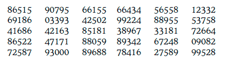 Предположим, что мы произвели N независимых опытов, в результате которых получили N случайных цифр. Записав эти цифры (в порядке их появления) в таблицу, получим то, что называется таблицей случайных цифр. Например, таблица из 150 случайных цифр может иметь следующий вид (цифры разбиты на группы для удобства чтения таблицы):