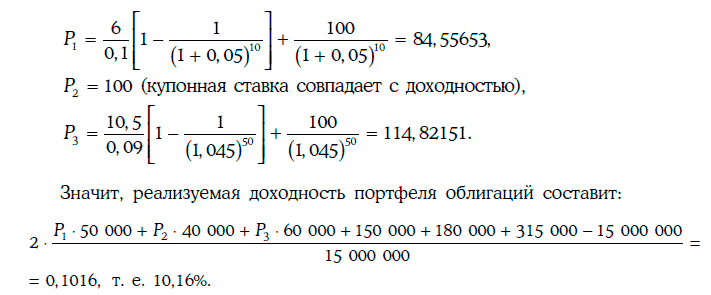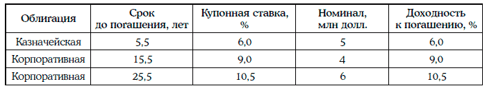 Пример 1.67 [5]. Инвестор владеет портфелем, состоящим из одной казначейской облигации и двух корпоративных облигаций одного и того же кредитного рейтинга. Основные параметры портфеля указаны в таблице: