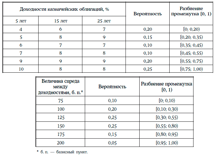 Первая итерация (случайные числа: 0,91 для кривой доходностей и 0,12 для спреда между доходностями). В этом случае доходности казначейских облигаций со сроком до погашения 5, 15 и 25 лет составят соответственно 10, 8 и 8 %, а доходности корпоративных облигаций со сроком до погашения 15 и 25 лет – 9 и 9 %.