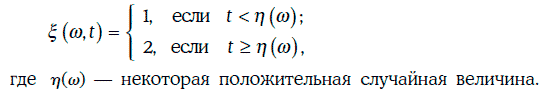 Сечением случайного процесса ξ(w, t) в момент времени t является случайная величина, принимающая значение 1 с вероятностью, равной P{η(w) > t}, и значение 2 с вероятностью, равной P{η(w) ≤ t}.