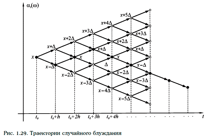 Траектории случайного блуждания изображены на рис. 1.29 (точками выделена одна из траекторий).