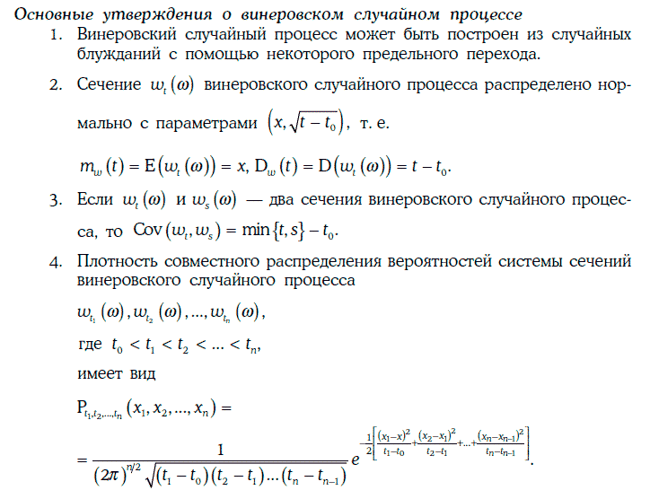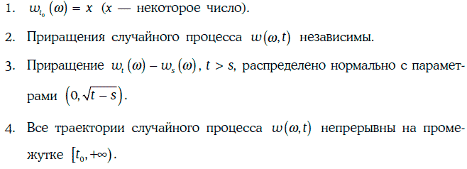 Случайный процесс w(w, t), определенный на промежутке [t0, +∞), называется винеровским случайным процессом (Wienerprocess), если выполняются следующие условия: