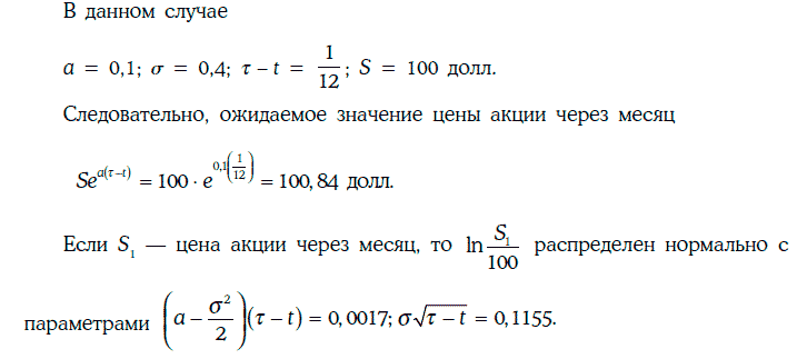 Пример 1.72. Инвестор считает, что цена бездивидендной акции описывается геометрическим броуновским движением с коэффициентом смещения 0,1 и годовой волатильностью 40 %. В данный момент времени цена акции равна 100 долл. Инвестора интересует цена этой акции через месяц.