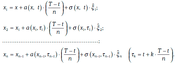 Чтобы смоделировать траекторию случайного процесса Ито на отрезке [t, Т], этот отрезок разбивается на n равных частей (n должно быть большим), а затем разыгрывается случайная величина ξ, распределенная нормально с параметрами