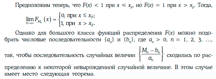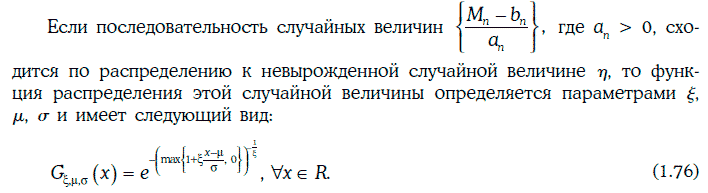 Если случайные величины η1, η2, …, ηn независимы и одинаково распределены, а n достаточно велико, то функция распределения случайной величины Mn = max{η1, η2, …, ηn} практически совпадает с функцией обобщенного распределения экстремальных значений (при подходящем выборе параметров ξ, μ и σ).