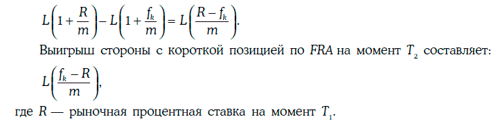 Сторона, занимающая длинную позицию по FRA, обязана через Т1 месяцев от текущего момента взять кредит размером L на срок Т2 – Т1 месяцев под контрактную процентную ставку fk. Сторона, занимающая короткую позицию по FRA, обязана через Т1 месяцев от текущего момента предоставить кредит размером L на срок Т2 – Т1 месяцев под контрактную процентную ставку fk.