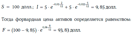 Пример 2.3. Найдем форвардную цену акции с поставкой через 8 месяцев, по которой дивиденды в размере 5 долл. ожидаются через 2 и 5 месяцев, если текущая цена акции равна 100 долл., а безрисковые процентные ставки на 2, 5 и 8 месяцев соответственно равны 5, 5,5 и 6 % (при непрерывном начислении процентов).