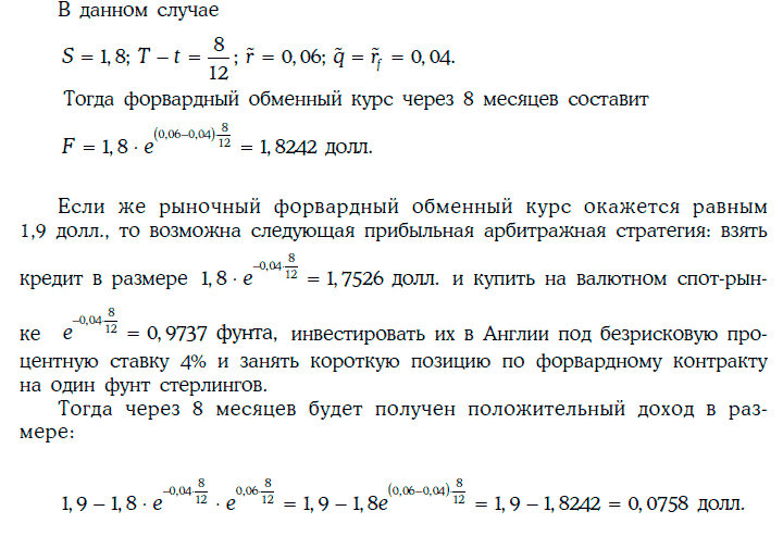 Пример 2.4. Найдем 8-месячную форвардную цену английского фунта стерлингов, если текущий обменный курс равен 1,8 долл. за фунт, а безрисковые процентные ставки в США и в Англии при непрерывном начислении процентов равны 6 и 4 % соответственно.