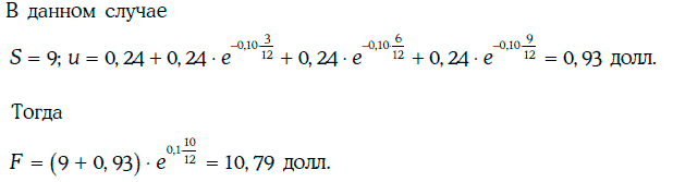 Пример 2.5. Найдем 10-месячную форвардную цену унции серебра, если текущая цена унции серебра равна 9 долл., затраты на хранение (охрану) составляют 0,24 долл. и выплачиваются поквартально вперед, а безрисковая процентная ставка для всех сроков при непрерывном начислении процентов составляет 10 %.