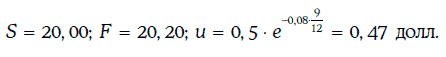 Пример 2.6. Оценим 9-месячную меру физической полезности одного барреля сырой нефти, если текущая цена барреля нефти равна 20,00 долл., затраты на хранение барреля нефти равны 0,5 долл. и оплачиваются в конце срока хранения, 9-месячная форвардная цена барреля нефти составляет 20,20 долл., а безрисковая процентная ставка на 9 месяцев при непрерывном начислении равна 8 %.