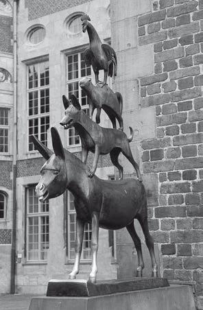 Из русской народной сказки «Собака а дятел»[1]В фольклоре многих народов имеются сказки про животных, которых хозяева вышвырнули из дома. От них избавляются, потому что они перестали приносить пользу: конь уже стар, кот вороват или чересчур блудлив, а барана хотели зарезать – вот он и сбежал. Животные сбиваются вместе и начинают самостоятельную жизнь в лесной избушке. Немецкий вариант этого фольклорного сюжета – сказка «Бременские музыканты» (популярный у нас одноимённый мультфильм – о другом). Четырём героям немецкой сказки в 1951 году в Бремене на Рыночной площади возле старинной ратуши был поставлен памятник («Skulptur der Bremer Stadtmusikanten»). Если уместно сравнивать традиционный сюжет с его позднейшим восприятием, то можно отметить архаичную крестьянскую жестокость хозяина, человека фольклорного, и – по контрасту – благодарную память нынешних горожан о животных-изгнанниках.