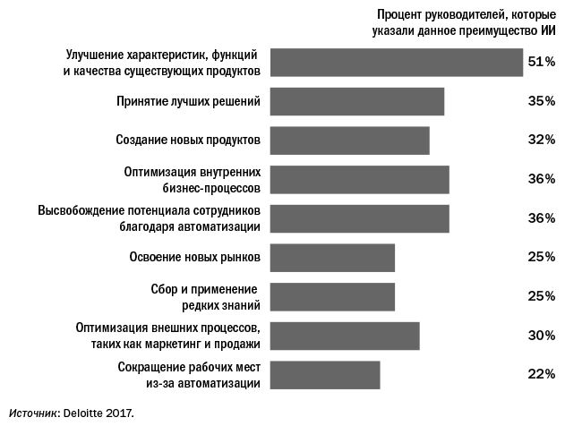 Выгоды от ИИ для бизнесаМы опросили 250 руководителей компаний, которые уже используют когнитивные технологии, чтобы узнать их цели в отношении ИИ. Более половины респондентов заявили, что их основная цель – улучшение существующих продуктов. Сокращение рабочих мест упомянули только 22 %.