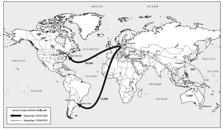 Город Белосток, вдохновлявший Горовица и Зона, представляет собой идеальное окно, через которое можно увидеть, как еврейская миграция привела к столкновению глобальных, национальных и местных проблем. В течение XIX и начала XX веков около ста тысяч евреев мигрировали сперва в этот город, расположенный в густо поросшем лесами регионе, отделяющем Польшу от Белоруссии и Литвы, и потом из него. Его рост и превращение из торгового городка в крупный промышленный центр был типичен для многих региональных столиц поздней Российской империи[29], когда неравномерное промышленное развитие России побудило миллионы людей переселяться из маленьких городов в крупные[30]. На примере событий XIX века в Белостоке можно проследить драматическое перемещение евреев в западных областях Российской империи и то, как оно спровоцировало развитие новых типов политических, религиозных и общинных институтов, которые стремились облегчить адаптацию еврейских мигрантов к городской жизни. В то время как эти организации изо всех сил пытались защитить евреев от экономических перипетий эпохи, политическая нестабильность и эпизодические вспышки насилия вынудили тысячи евреев покинуть Белосток и отправиться в далекие страны, такие как Соединенные Штаты (50 000), Аргентина (20 000), Австралия (5 000) и Палестина (20 000). Независимо от того, селились ли эти мигранты на многолюдных улицах Нижнего Ист-Сайда в Нью-Йорке или на небольших фермах в аргентинских пампасах, евреи из Белостока усердно приносили в свои новые дома ранее сложившееся у них понимание политических, социальных и общественных институтов, выработанное еще в Восточной Европе[31].