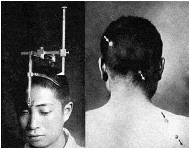 Рис. 2. Фотография солдата, обследованного Иноуэ, на ней продемонстрировано применение краниокоординометра (слева) и показана траектория движения пули через тело солдата (справа). Источник: Die Sehstörungen bei Schussverletzungen der kortikalen Sehsphäre (Зрительные нарушения как результат пулевого ранения в зрительной области коры). Leipzig: W. Engelmann, 1909.