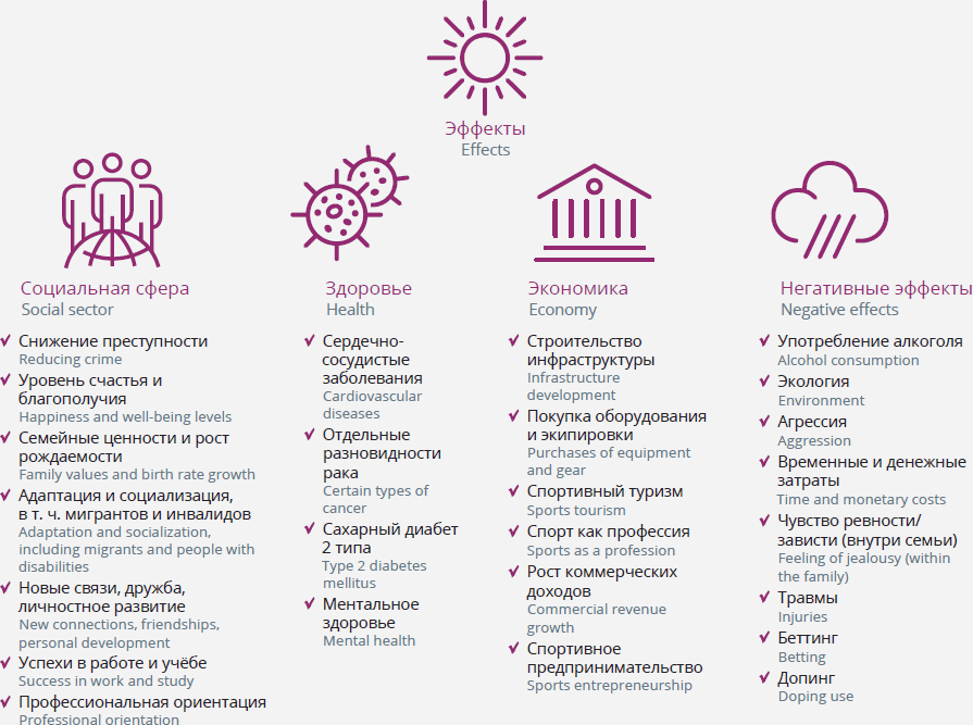 Эффекты, формируемые спортивными проектами, могут быть классифицированы на позитивные и негативные, а по направлениям воздействия – в разрезе социальной сферы, здоровья и экономики.