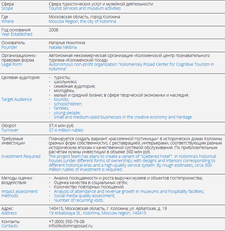 The activity of Kolomensky Posad is a driver of social, cultural and economic development of the territory based on the history of the place, traditional forms of economic management, the growing trend of domestic tourism development, cooperation with local communities, and heritage management.