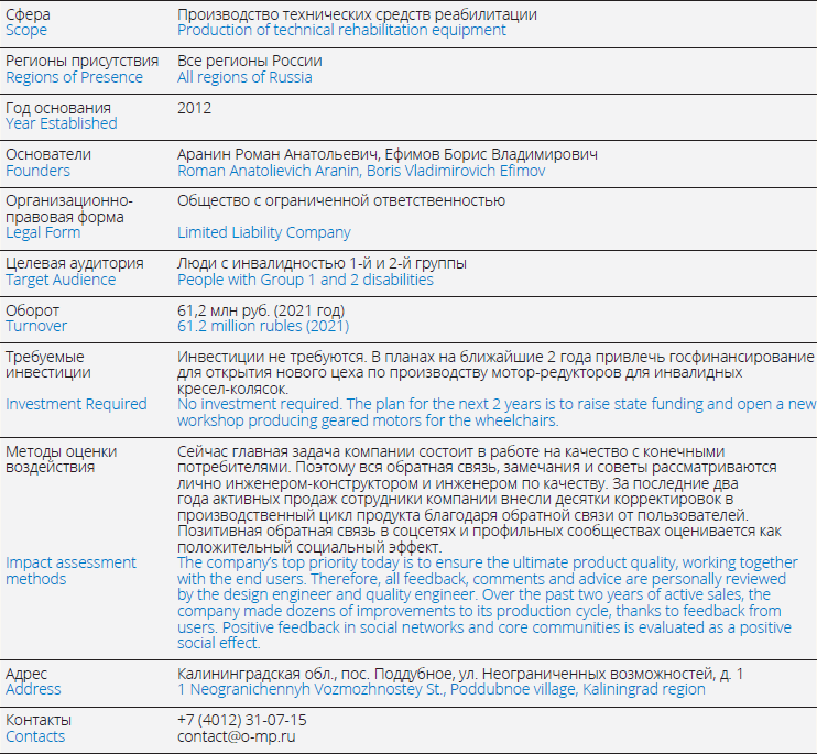 Winner of the “Best Social Project of the Year” All-Russian social entrepreneurship contest – 2019 (company founder Roman Aranin in the nomination “Best Social Entrepreneurship Project in the Development of Technical Rehabilitation Equipment”).