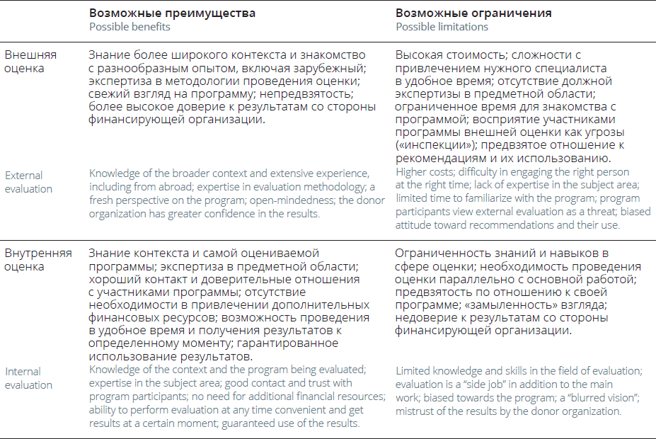 Now back to John Gargani’s prediction (Gargani, 2012). He suggested that internal evaluation in the U. S. would largely replace external evaluation within 10 years. Thus, most program and project evaluations in the United States would be internal by 2022. Apparently, this has not happened yet, but we can definitely state that internal evaluation is developing in both government and non-government organizations in the United States, Canada, Japan, and many other countries. Russia is no exception.
