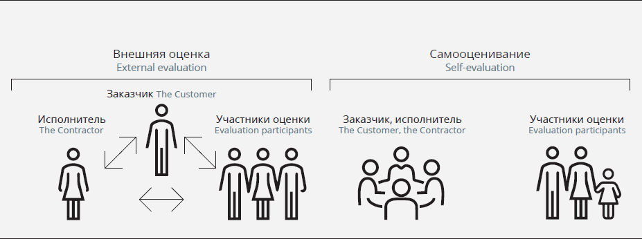 A program (project) self-evaluation is the systematic collection of information about the activities of the program (project), its characteristics and outcomes, which is performed by the program (project) team to make judgments about the program (project), improve the effectiveness of the program (project), and/or inform decisions about future programming. The difference between this definition and the generic definition given at the beginning of the article is all in the italicized text: here, everything is done by the project team itself. The people implementing the project also set the evaluation task, plan the evaluation, collect the data (while also serving as important sources of information), analyze the data, formulate the evaluation results, and use them – all on their own. It turns out that in self-evaluation, the project team acts as the customer, the contractor, and the evaluation participants (see Figure 1).