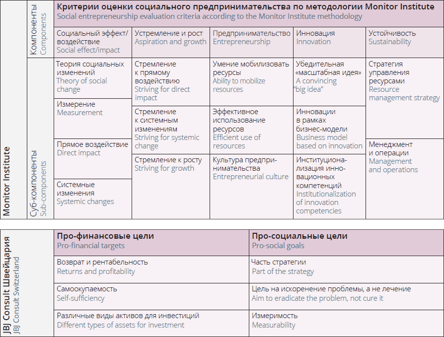Необходимость оценки экономической устойчивости и финансовых показателей деятельности организации социального предпринимательства подтверждается успешным опытом западных компаний, ведущих консалтинговую деятельность в области социального импакта (см. Рис. 1). Например, оценку рентабельности, самоокупаемости, возврата инвестиций и других финансовых показателей проводит швейцарская JBJ Consult, ориентированная на то, чтобы бизнес их клиентов приносил и финансовую, и социальную отдачу. Другим примером может служить Monitor Institute by Deloitte, которая работает с организациями социального воздействия и выстраивает их эффективную работу как в области импакта, так и в области управления организацией и ее ресурсами.
