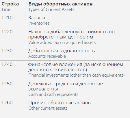 Таблица 1. Виды оборотных активов в форме бухгалтерского баланса