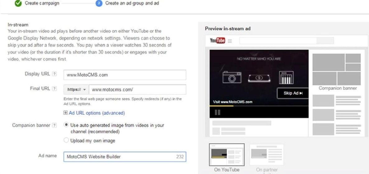 Вставьте URL своего видео и выберите формат объявления.