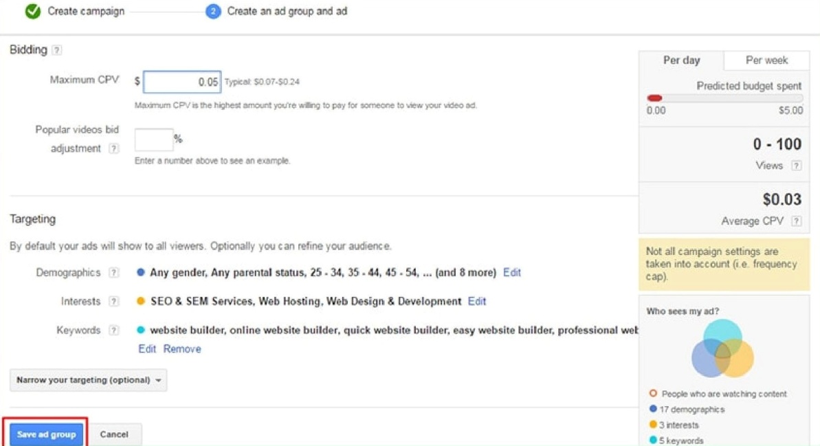 Затем введите информацию о ставках и настройте таргетинг.