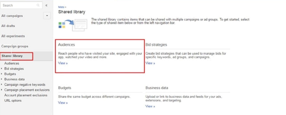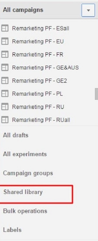 Ремаркетинг – это специальная кампания, направленная на привлечение людей, которые уже посещали ваш сайт, но ничего не заказали и не приобрели. Для настройки ремаркетинговой кампании выберите вкладку Общая библиотека.