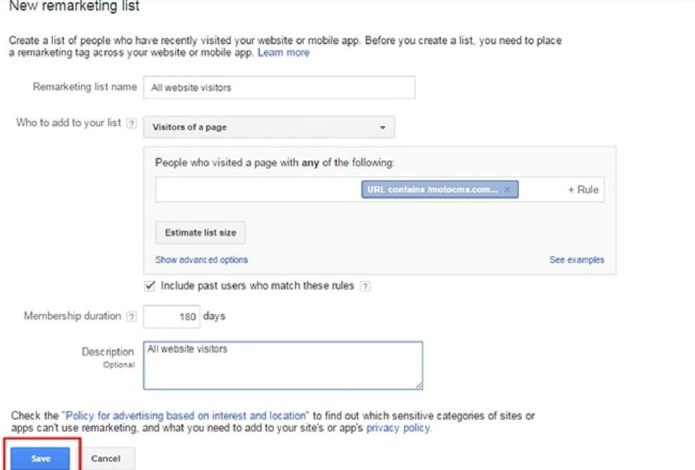Так выглядит процесс создания нового ремаркетингового списка.