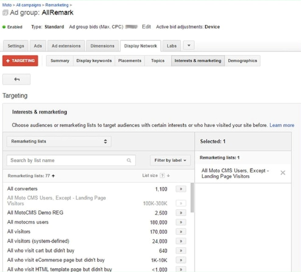 После определения ремаркетинговой аудитории можно начинать кампанию. Процесс ее создания напоминает работу над контекстно-медийной кампанией. Тем не менее, есть одно исключение. Выбирая целевую аудиторию, нужно указать ремаркетинговый список, который вы только что создали.