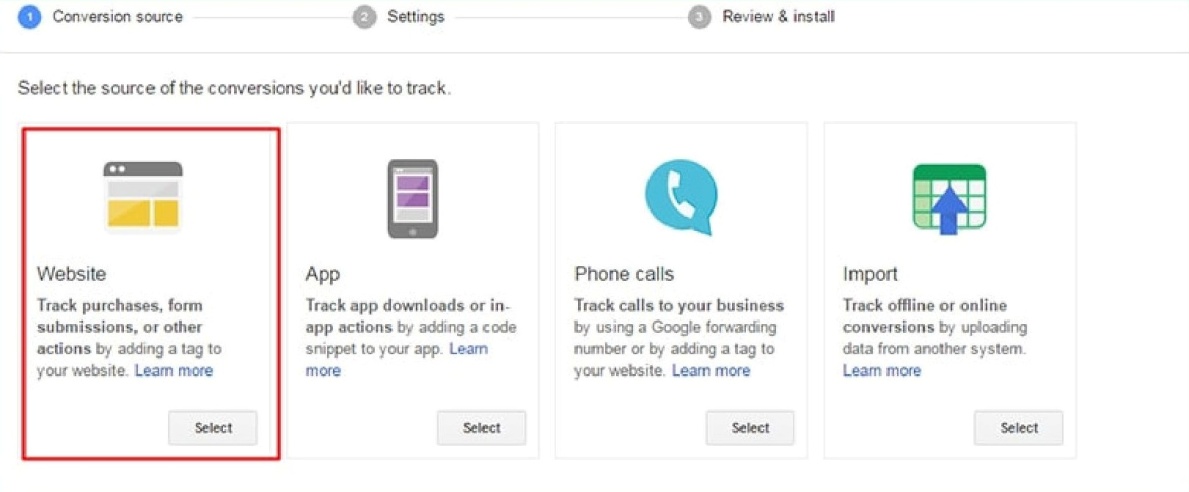 Выберите источник конверсии: веб-сайт, приложение, телефонные звонки или импорт. Последний вариант – это оффлайн-конверсия. К примеру, клиент нашел то, что искал, но купил эту вещь не на сайте, а в вашем магазине.