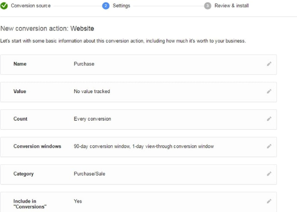 После выбора источника конверсии придется поработать с рядом настроек (Название, Ценность и т.д.).