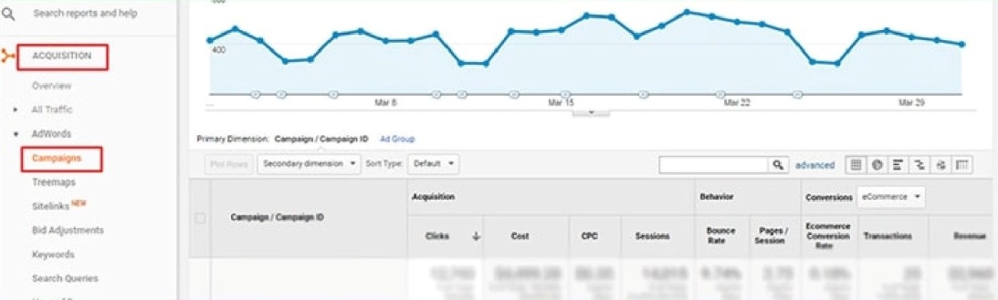 Для анализа данных из GoogleAdWords в Analytics используйте вкладку GoogleAdWords, где есть все, что нужно для контроля кампаний: стоимость, цена за клик, показатель отказов и т.д..